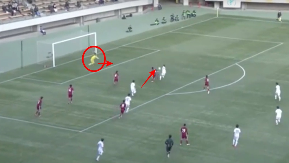 ゴールキーパーの立っているポジション自体が前で、もっとボールに近づいていることができたのならば、前に出て先にボールに触ることはできたかもしれません。