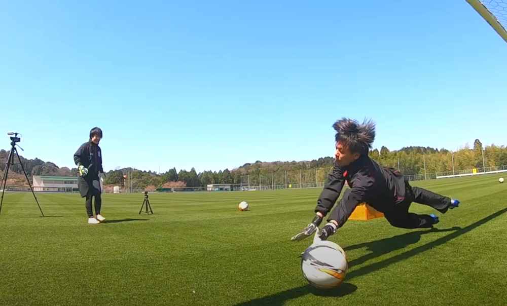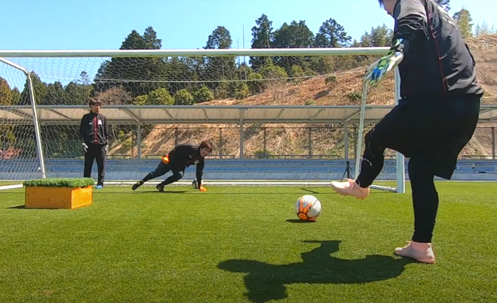 GKコーチがゴールキーパーの後ろからランダムに蹴っていきます。