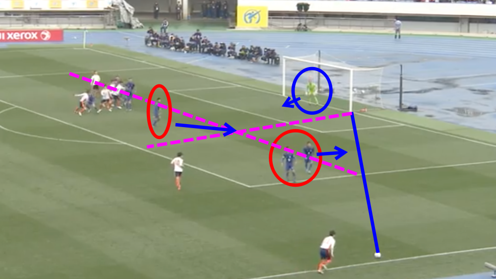 考え方としては、まずはフリーキックの壁を【ボールとニアポストを結んだ線上】を2人の間に持ってくる。