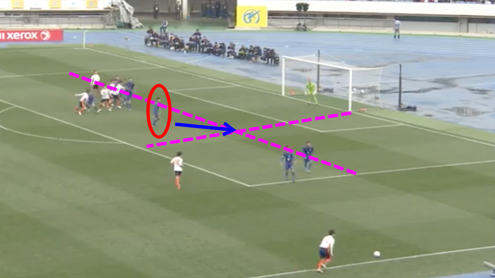 そうすることで、シュートとニア付近のクロスを避けることができる。