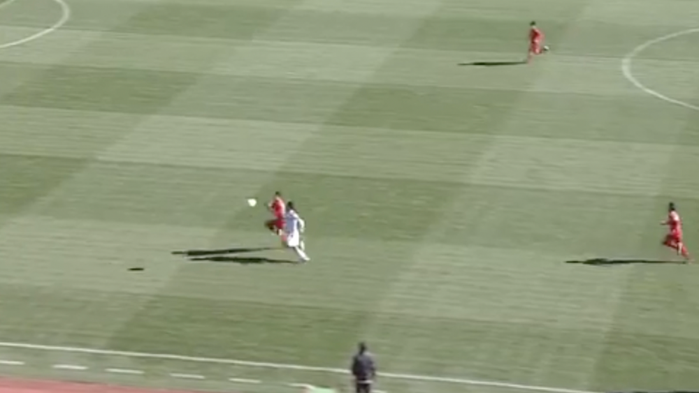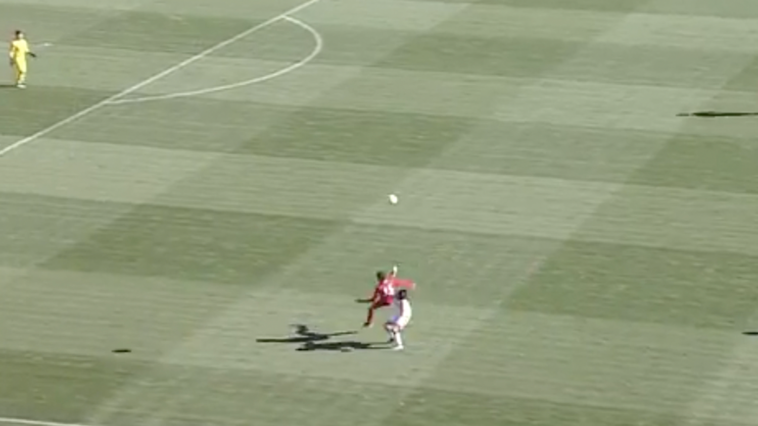 DFラインの背後に入ったボールがバウンドし、それを丸山海大がヘディングでクリアしようとプレーに入ります。