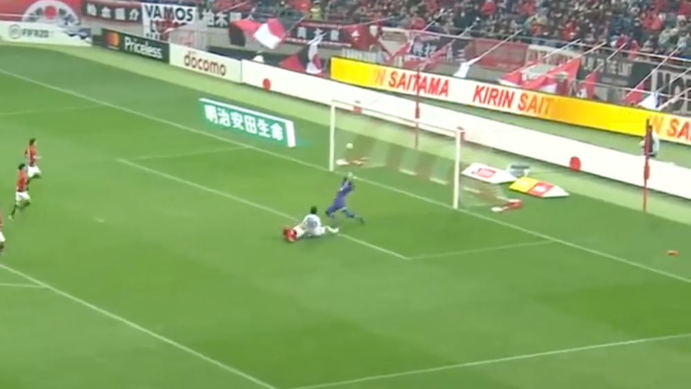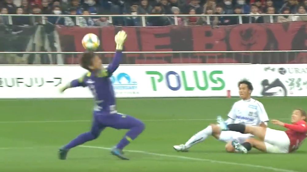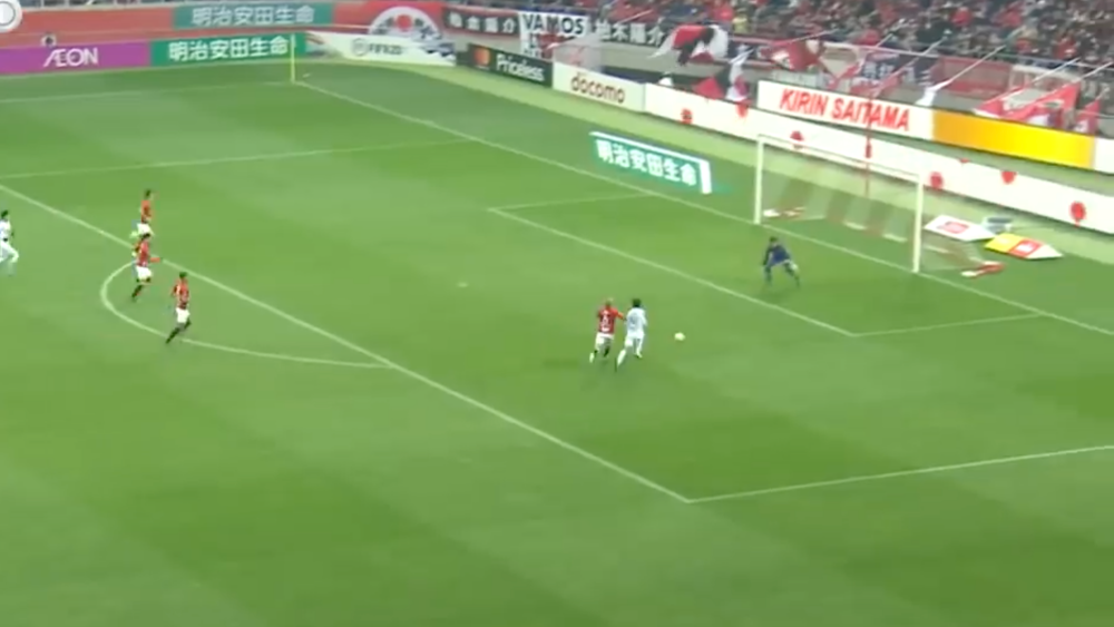 浦和レッズGKの西川周作選手が背後のパスを狙っている!